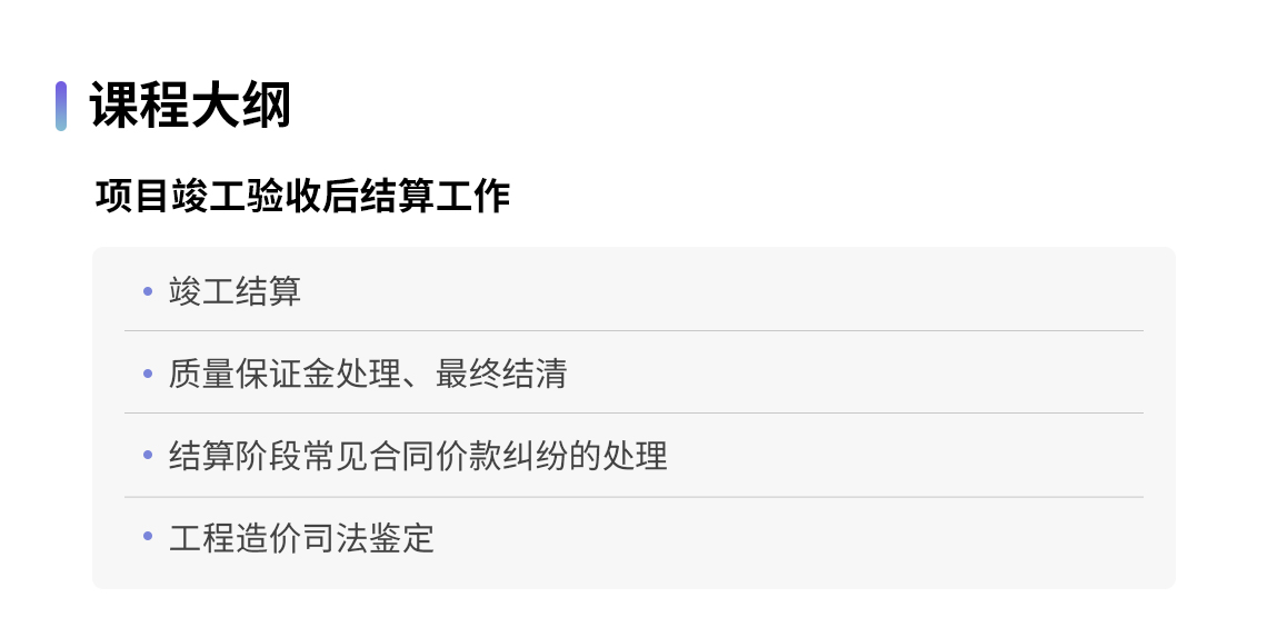本次课程重点讲解竣工后的结算管理,涉及到质量保证金的处理、最终结清要点以及结算阶段常见的合同价款纠纷处理,通过学习帮助学员顺利完成工程结算,保证项目及公司利益不受损害。