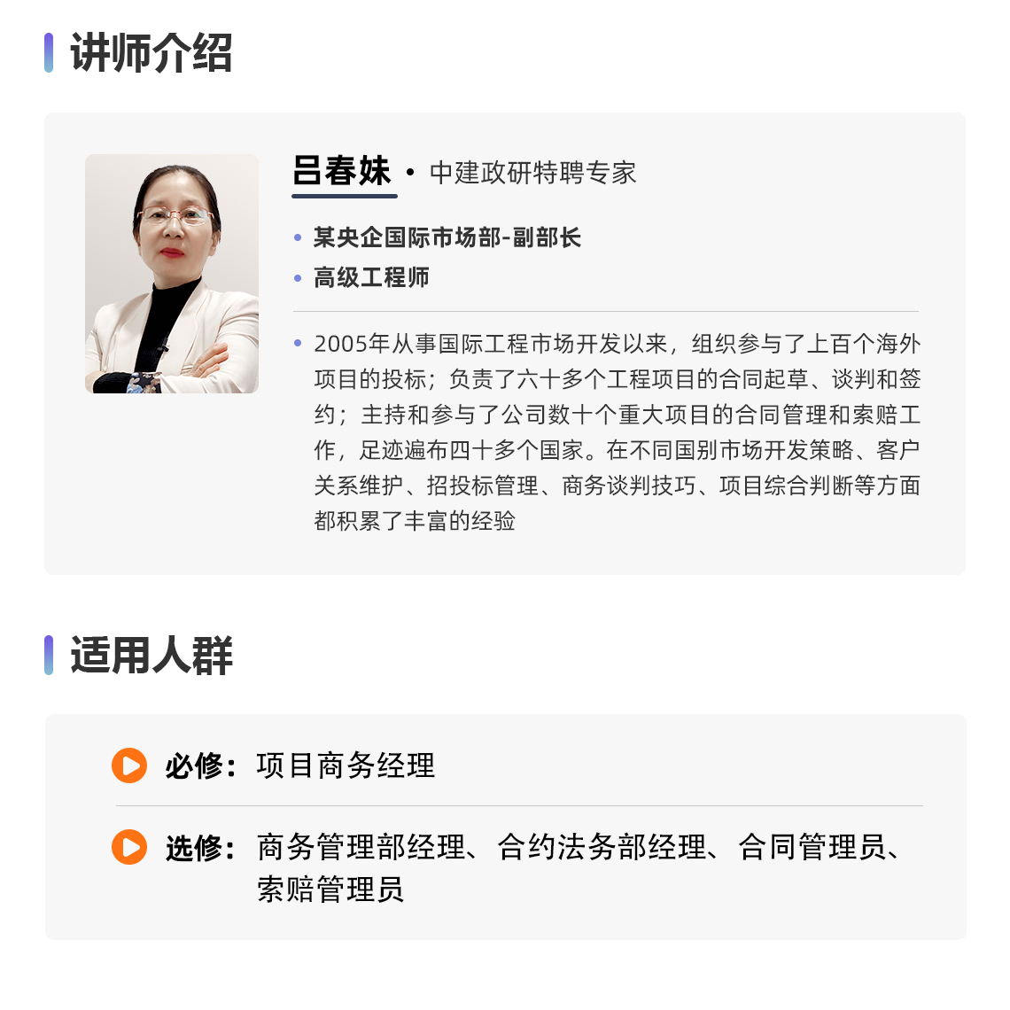 本课程通过对FIDIC 2017工程变更条款、商定或决定条款、索赔条款详细解读,透彻分析和梳理国际工程变更和索赔管理中的重点、难点和痛点问题,帮助学员加深对合同的理解,能够根据法律依据和现实情况推动国际工程项目变更与索赔工作。