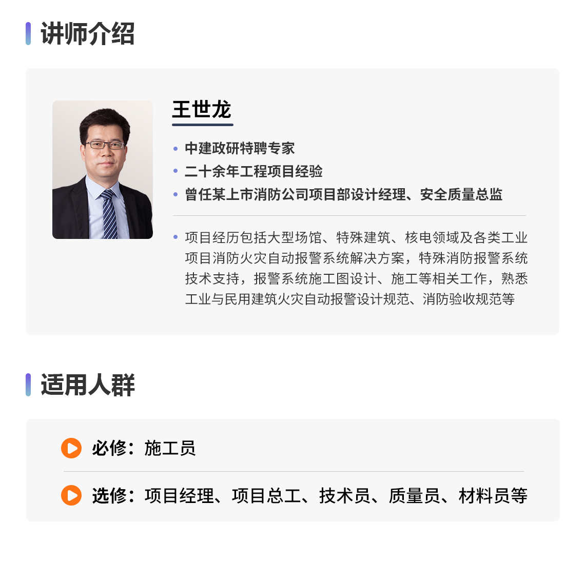 《消防闭式喷水灭火系统施工流程》系列课程背景 闭式喷水灭火系统作为重要的消防设施,其施工质量直接影响其灭火效果和可靠性。通过明确的施工流程,可以确保每一步施工都符合规范要求,减少因施工不当导致的系统故障。 本系列课程主要介绍闭式自动喷水灭火系统的施工流程,通过介绍系统原理、材料选型(喷头、报警阀组、水泵等)、工程施工过程中的技术要点、系统的调试及验收要求等内容,帮助学员掌握施工过程中的质量控制要点、系统调试及基本的故障分析内容、工程施工质量评估等专业知识,通过材料选型及控制施工质量,帮助项目达到节约工程成本、保证施工进度质量的目的。 系列课包括: 1.消防闭式喷水灭火系统基本施工原理 2.消防闭式喷水灭火系统的安装、调试、验收及维护