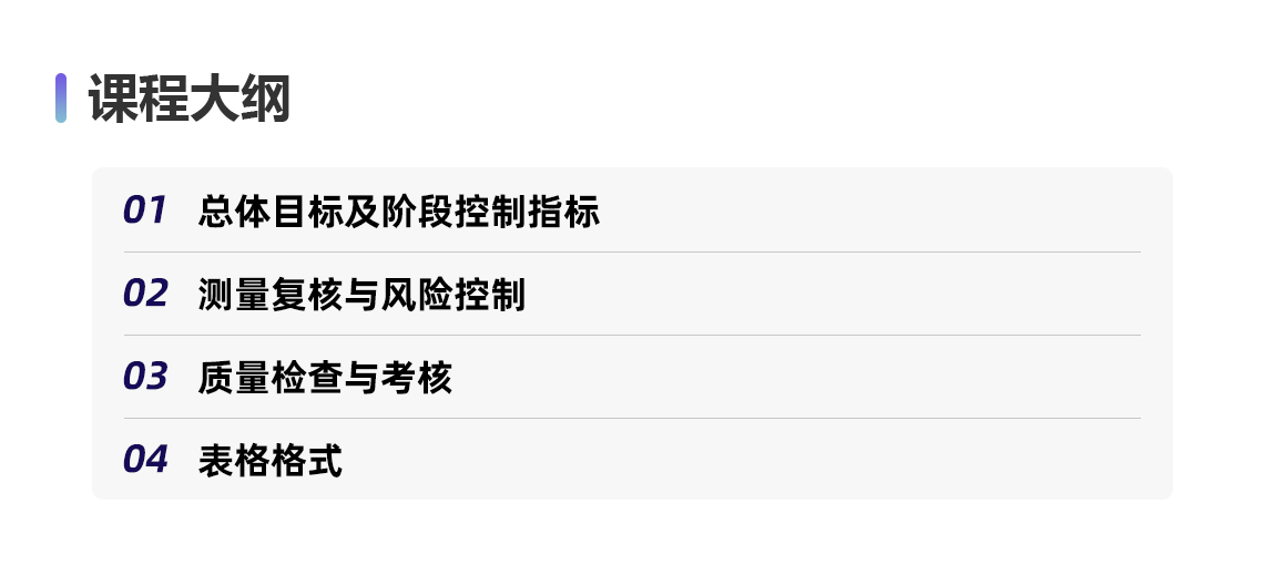 . 熟悉地铁工程施工测量总体目标及阶段控制指标 . 掌握地铁施工测量复核与风险控制相关内容 . 掌握地铁施工测量质量检查与考核要点 . 掌握地铁施工测量常用表格格式与填写规范