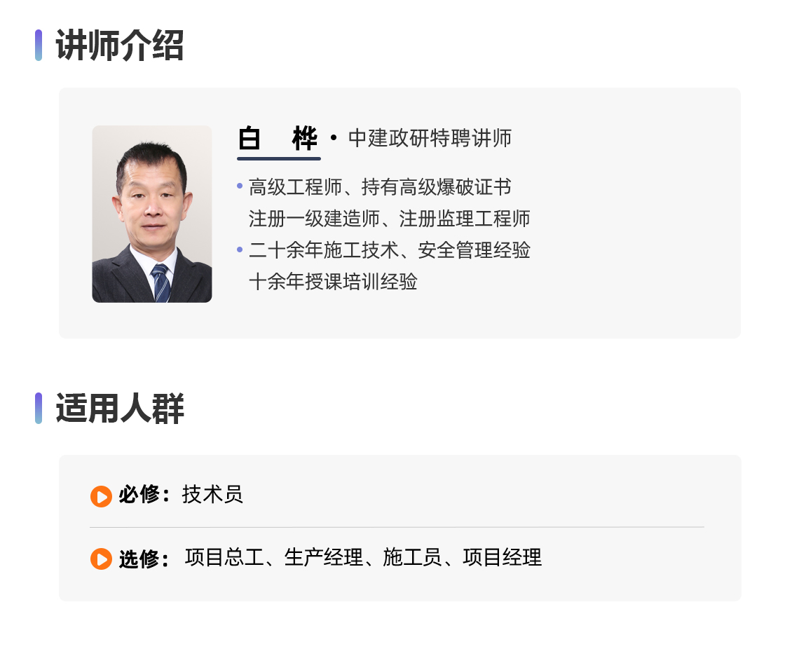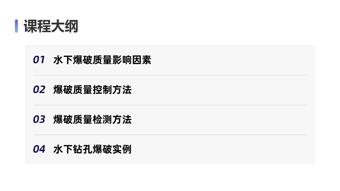 本系列课程在讲解水下钻孔爆破作用基本原理和施工工艺的同时,提炼掌握水下钻孔爆破技术实施过程中需要考虑的布置因素、注意要点、原因分析、解决方法等,并且对影响水下爆破施工质量的因素作出总结并给出解决方案。通过学习帮助学员写出针对性的专项施工方案和技术交底用于指导水下爆破施工技术管理工作,并顺利通过方案的专家论证。 本系列课程共包含三门课,分别是: . 水下钻孔爆破施工:施工基础与参数设计 . 水下钻孔爆破施工:作业平台与施工工艺 . 水下钻孔爆破施工:质量控制与案例应用