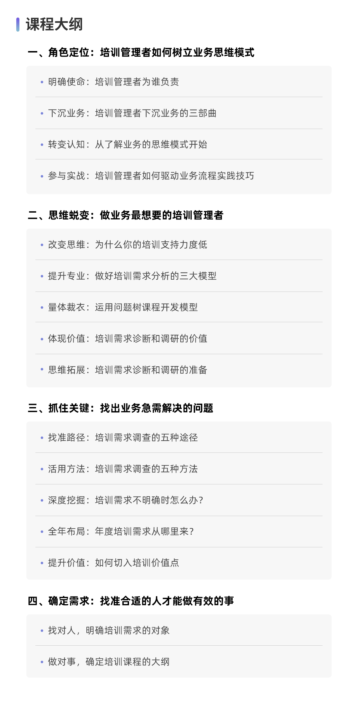 在经济全球化的今天,企业要提升生存能力和持续发展,就必须能够吸引、培养和留住人才。企业培训起到至关重要的作用,它是保持竞争力的“发动机”,而要做好企业培训的工作,培训需求分析是培训管理工作的起点和难点,需求掌握不准,将会造成“计划没有变化快”,培训计划“走形式”,计划实施中困难重重。 本课程由浅入深,实践与理论相结合,旨在让学员现场掌握培训需求的各种分析方法,学会运用相关理论依据做好培训需求分析,完善培训方案的设计。真正站在培训管理者的角度,向培训管理者提供了一系列具有实务操作性的思路、工具和方法,帮助企业、培训管理者做好培训体系的搭建、培训工作的落地。