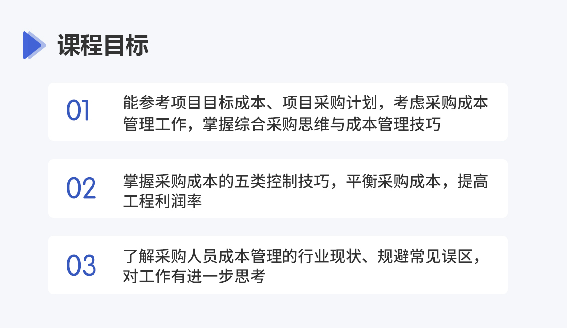 本课程从工程采购成本的分类、特点、控制要点、控制技巧、管理误区等多角度出发,结合实际工作场景,以问题为导向,提炼采购成本管理中的重难点,引导学员思考并找到解决思路。
