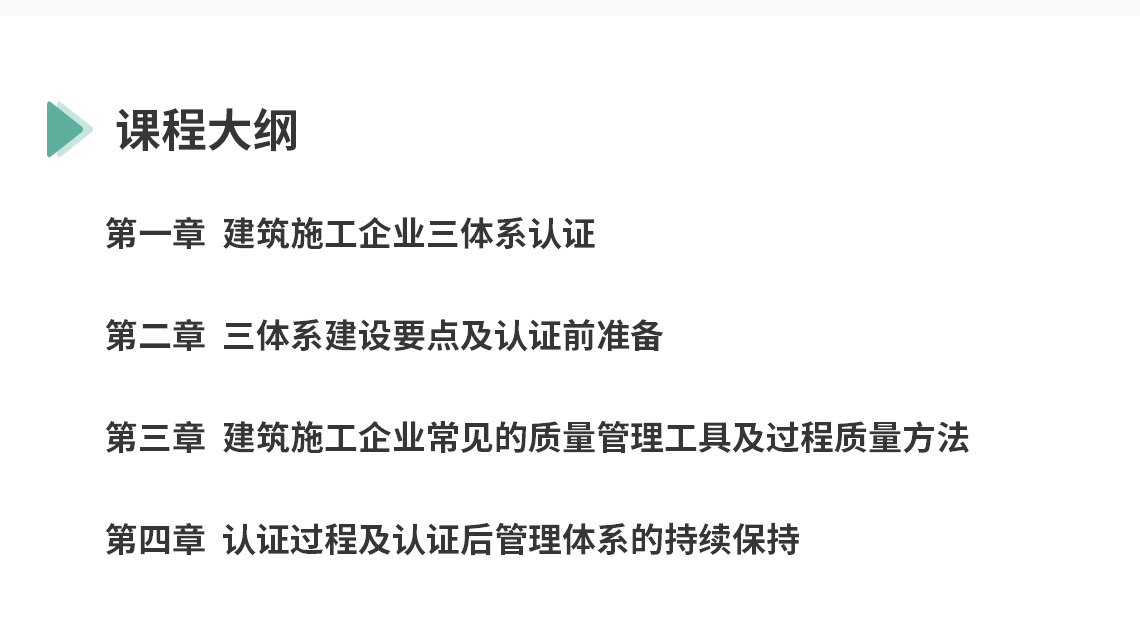 本课程结合老师三体系管理的丰富经验,系统讲解施工企业三体系认证及实施的相关知识,帮助学员掌握认证的流程、实施与持续保持的要点,能够从容应对专家审核检查,并做好相应的过程控制和管理工作,切实提升建筑工程质量、达到安全控制和保护环境要求。