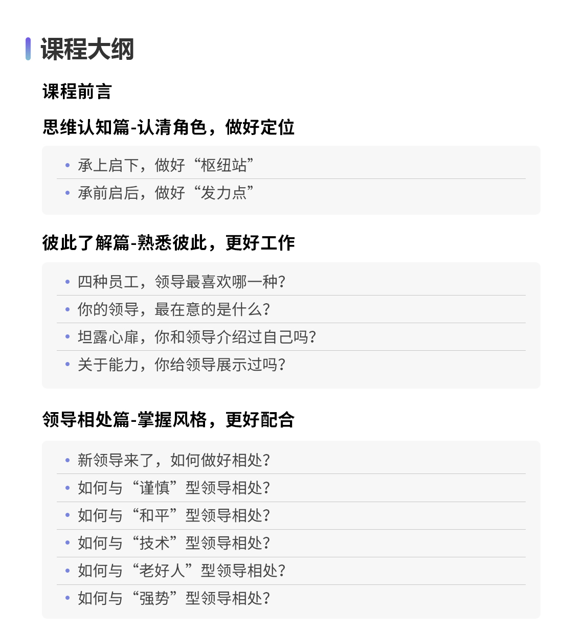 中层管理者既是管理者又是上级领导的下属,起到的是承上启下的作用。中层管理的向上管理是站在上级领导的角度考虑问题,换位思考并保持同理心。保持同频沟通,多反馈,多进行正式或非正式的沟通,增强彼此之间的信任感,达到或超过领导的心理预期。本门课程从思维角度出发,从作为下属的认知层面进行剖析,为学员讲解向上管理必备的认知保障。