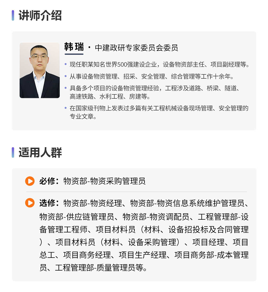 · 掌握大宗材料采购招标程序步骤及审核流程 · 掌握采购计划的审核要点 · 掌握招标文件的编制与审核要点 · 掌握招标活动开展、合同签署、履约及收尾时的管理要点,规避风险