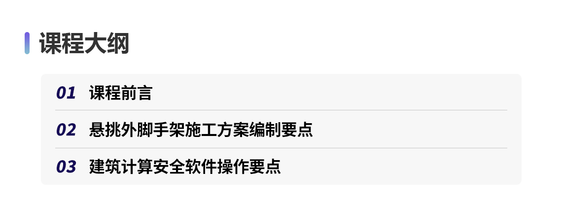 本课程通过解析《危险性较大的分部分项工程安全管理规定》(住建部〔2018〕37号令)、《危险性较大的分部分项工程安全管理规定》有关问题的通知(建办质〔2018〕31号文)及《危险性较大的分部分项工程专项施工方案编制指南》,介绍方案编制要求,结合工程具体实例背景剖析方案编制注意事项,并通过实例演示如何依据计算安全软件编制计算书。 通过课程的学习,可以帮助学员掌握悬挑外脚手架方案编制要点,能够使用软件快速生成脚手架计算书,独立完成专项施工方案的编制与审核工作。